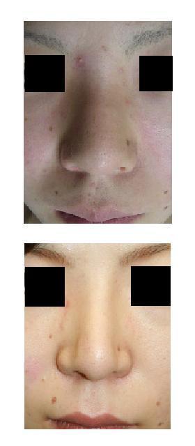 下段:術後(鼻尖縮小術、鼻根縮小術)5ヶ月目再診時です。(写真は患者さんの快諾を得て供覧しています)