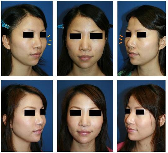 上段の写真でオレンジ色で強調している部分が患者さんが気にされていた頬骨の前側方の張り出しでした。 一年後の再診写真では同部位がすっきりしているのがよくわかります。